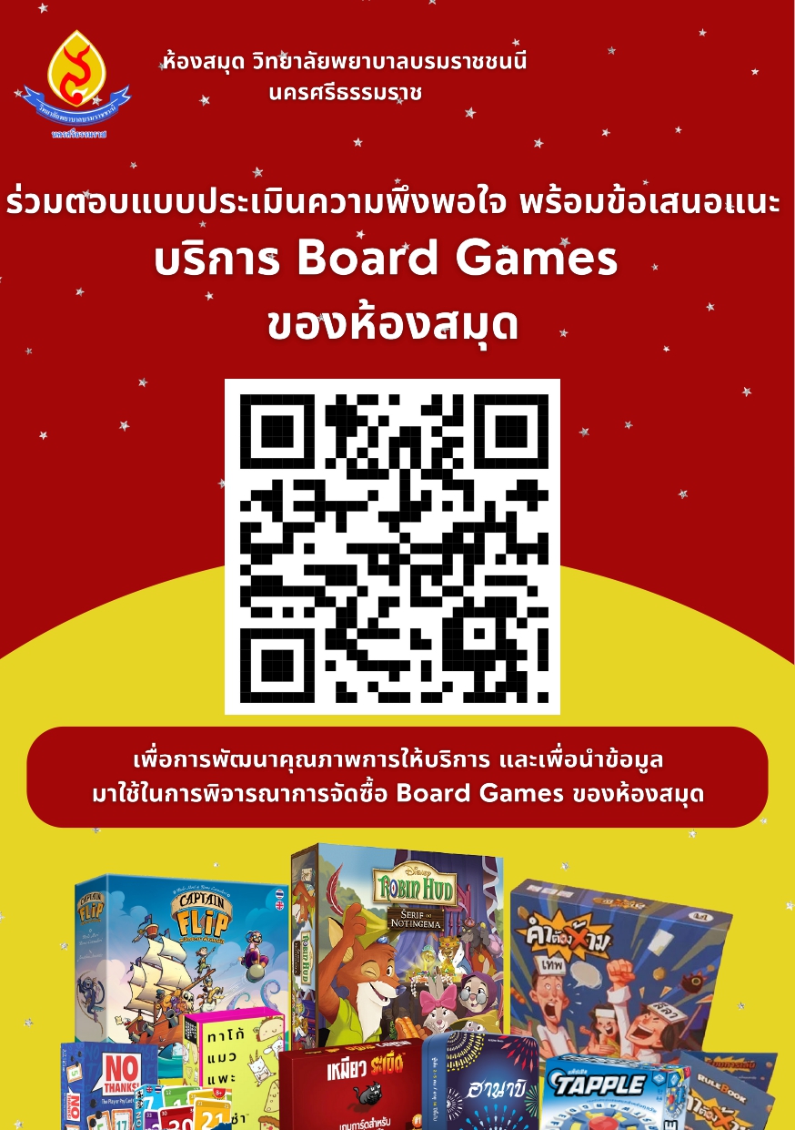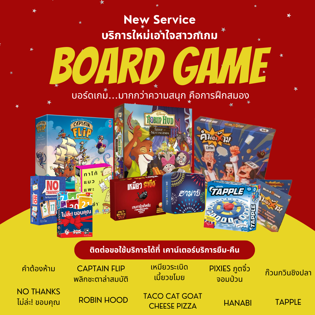 บอร์ดเกม (Board Game) ถือเป็นสื่อการเรียนรู้ยุคใหม่ที่ช่วยพัฒนาทักษะด้านต่างๆ เช่น การพัฒนาสมอง การคิด การตัดสินใจ รวมถึงทักษะด้านอารมณ์และการพัฒนาทักษะด้านการสื่อสาร โดยการใช้อุปกรณ์ในการเล่นเกมผ่านแผ่นกระดาน ตัวหมาก การ์ด และอุปกรณ์อื่นๆ โดยห้องสมุดจัดหาบอร์ดเกมให้ยืม จำนวน 13 รายการ
